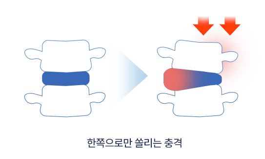 또한, 척추가 한쪽으로 틀어지게 되면 양 방향으로 고르게 충격이 분산되지 않고,